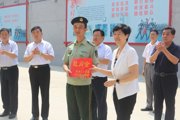 军地团结,真情共叙。在第91个“八一”建军节来临之际,2018年7月24日,县委书记李志红、县人大常委会主任胡新符、县政协主席闫波、县委办公室主任张德平、县委政法委书记李兆岚、县武装部政委王强、县政府领导田利国、县武装部部长李国华、县委办公室副主任张新地等党政军领导在县民政局局长张淑星的陪同下,先后到济宁市军分区、山东陆军预备役炮兵师、县公安消防大队、县人武部、县武警中队进行八一走访慰问,对广大官兵致以节日的问候,并分别送去了20000元慰问金。